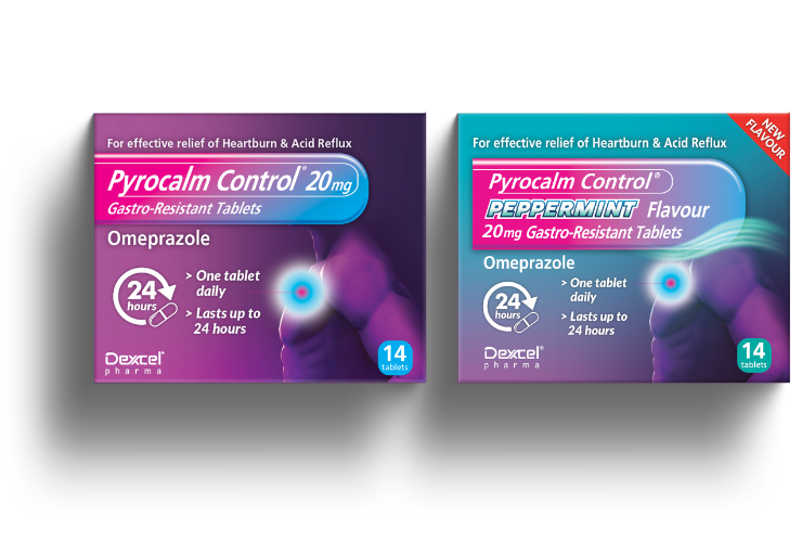 Pyrocalm Control 20mg Gastro-Resistant Tablets (omeprazole) is available over the counter without a prescription. It can be used for the short-term treatment of reflux symptoms including heartburn and acid reflux.1 It provides up to 24-hour confidence in heartburn control.